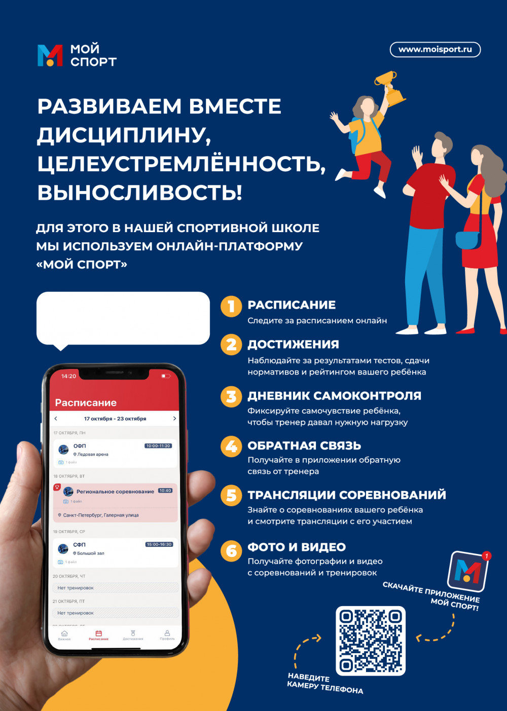 На платформе МОЙ СПОРТ Родители будут всегда в курсе достижений своих детей и смогут контролировать расписание и посещение занятий ребёнком, видеть все достижения юного атлета, просматривать фото и видео с тренировок и соревнований, смотреть онлайн-трансляции соревнований, всегда быть на связи с тренером, даже не посещая спортивную школу.
